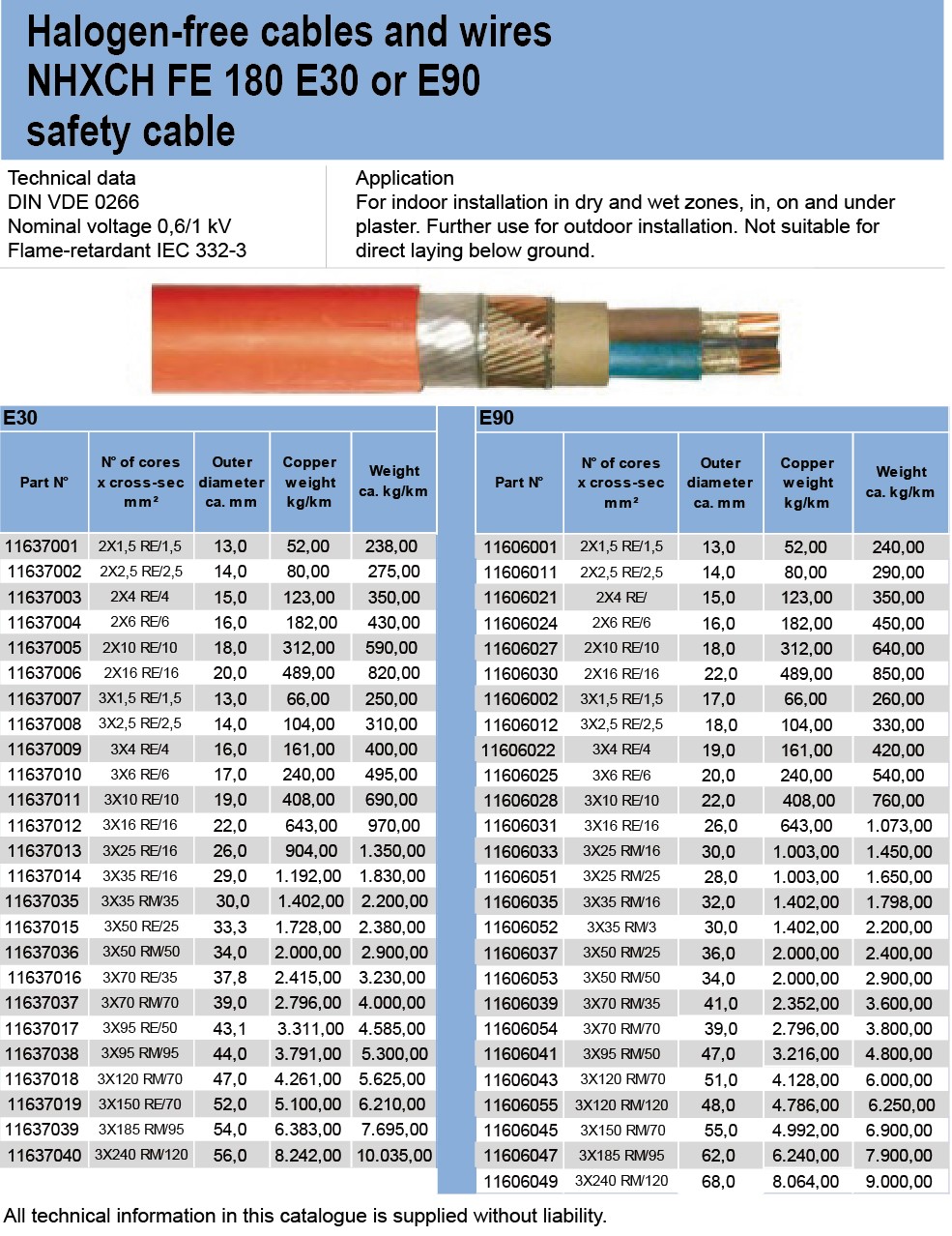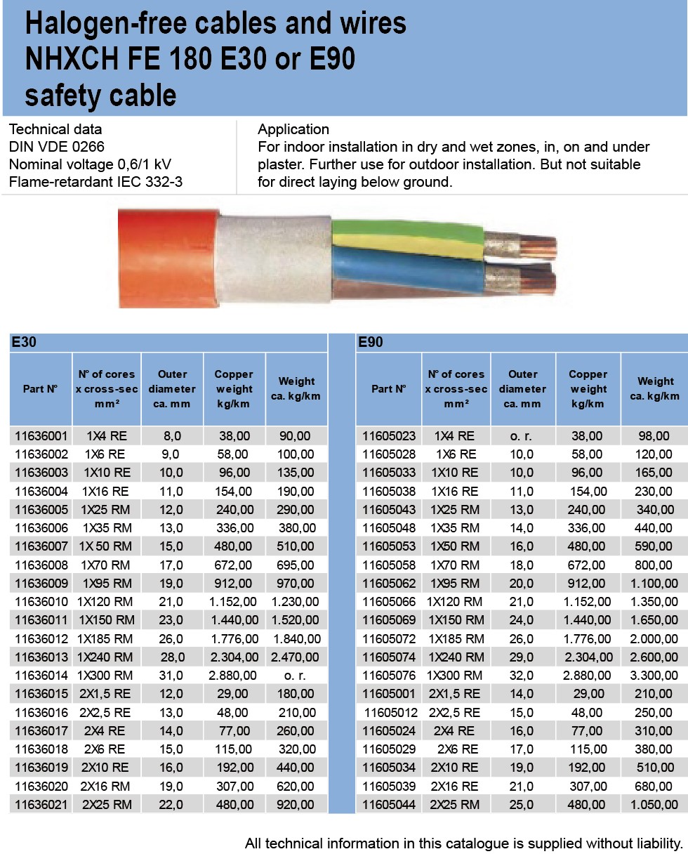 Halogen-free caples and wires NHXCH FE 180 E30 or E90. safety cable