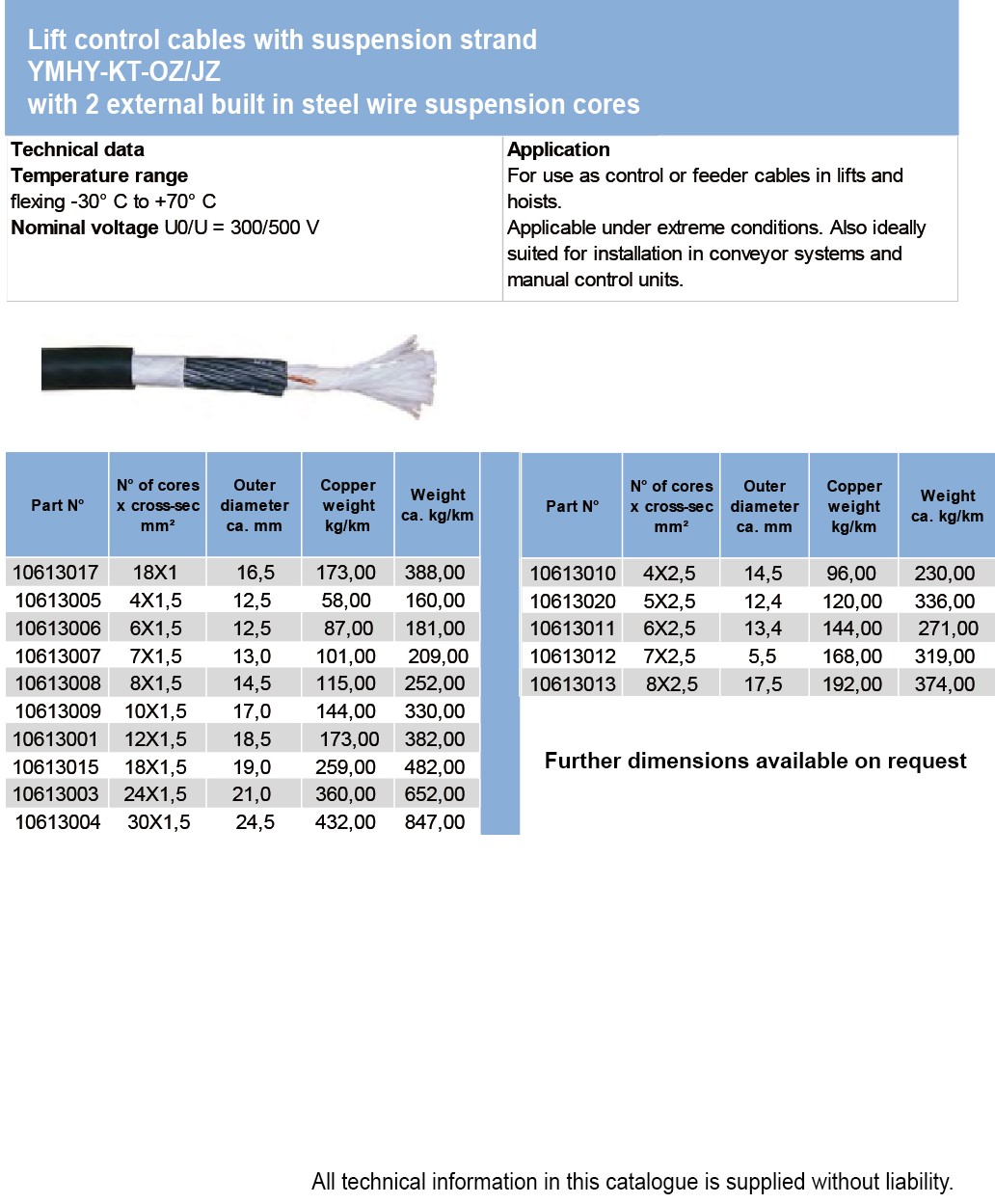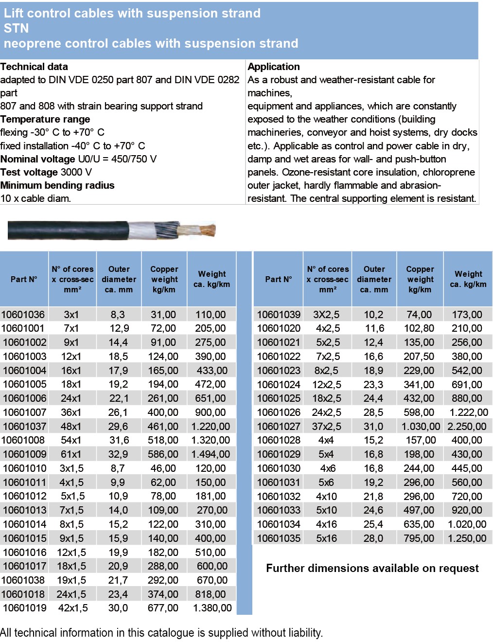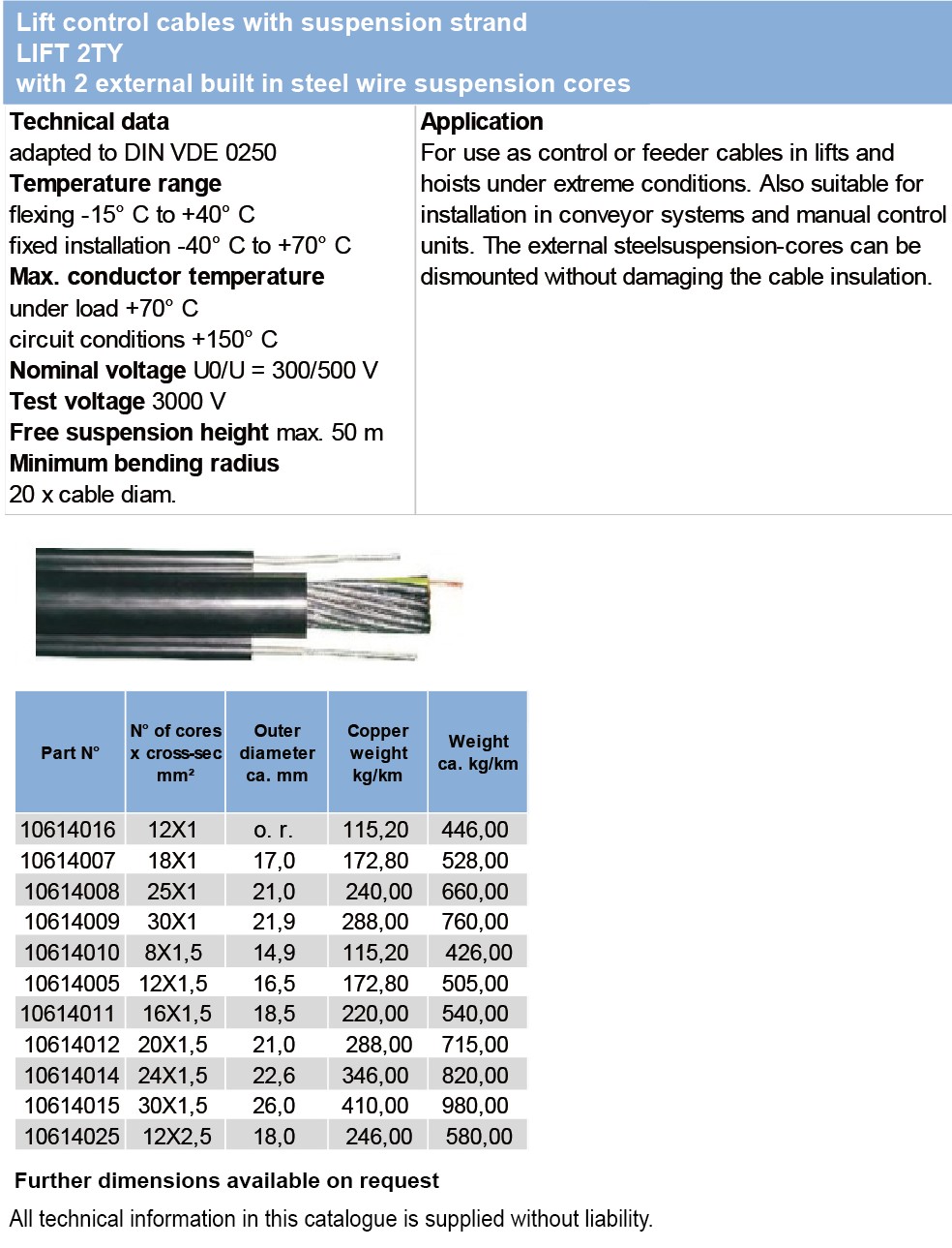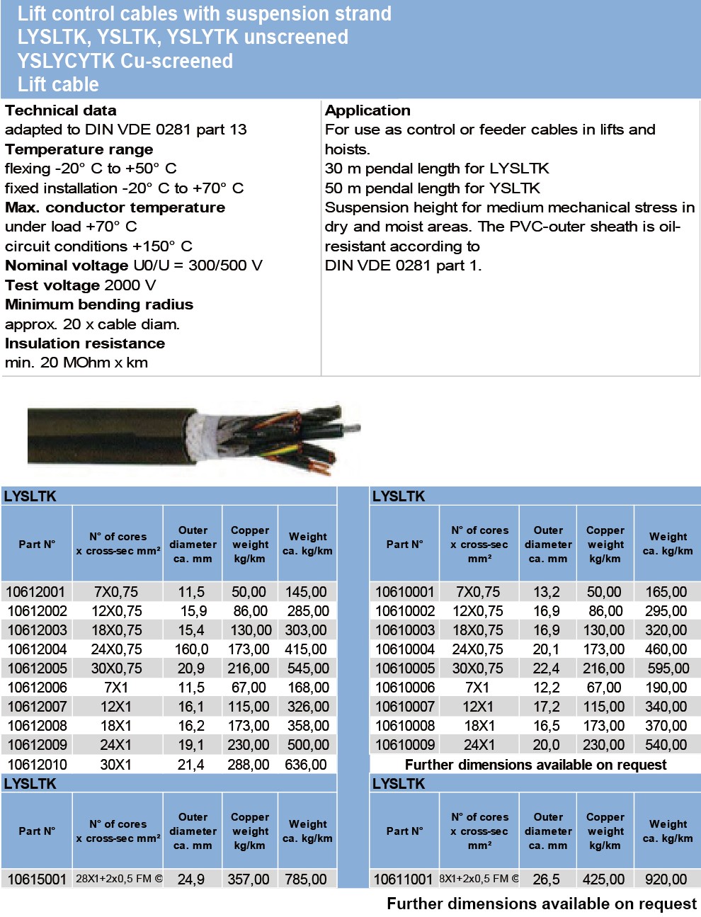 Lift control cables with suspension strandLYSLTK,YSLTK, YSLYTK unscreened YSLYCYTK Cu-screened Lift cable