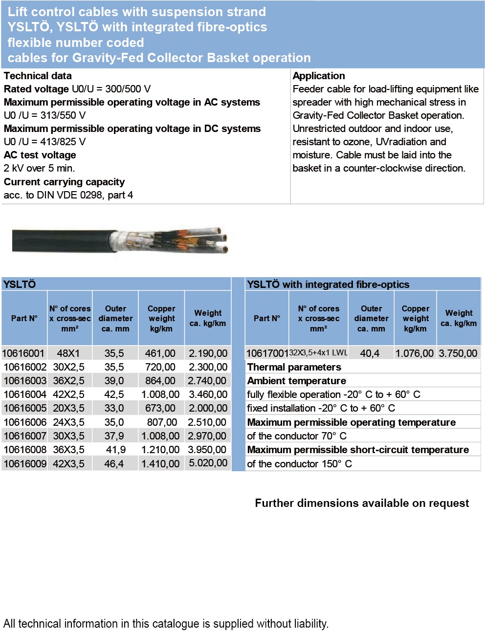 Lift control cables with suspension strandYSLTo, YSLTo with integrated fibre-optics flexible number coded cables for Gravity-Fed Collector Basket operation