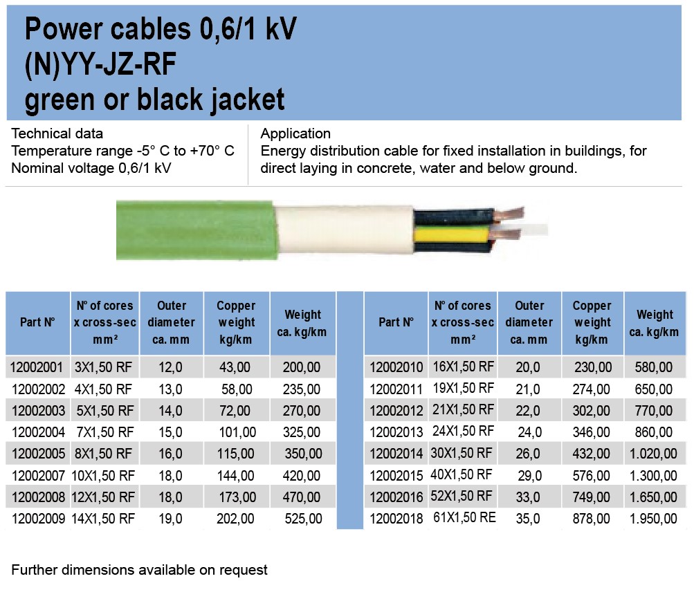 Power cables 0.6/1 kV(N)YY-JZ-RF green or black jacket