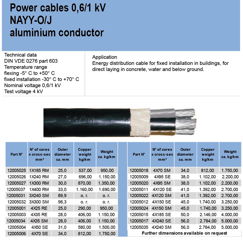 Power cables 0.6/1 kyNAYY-O1J aluminium conductor