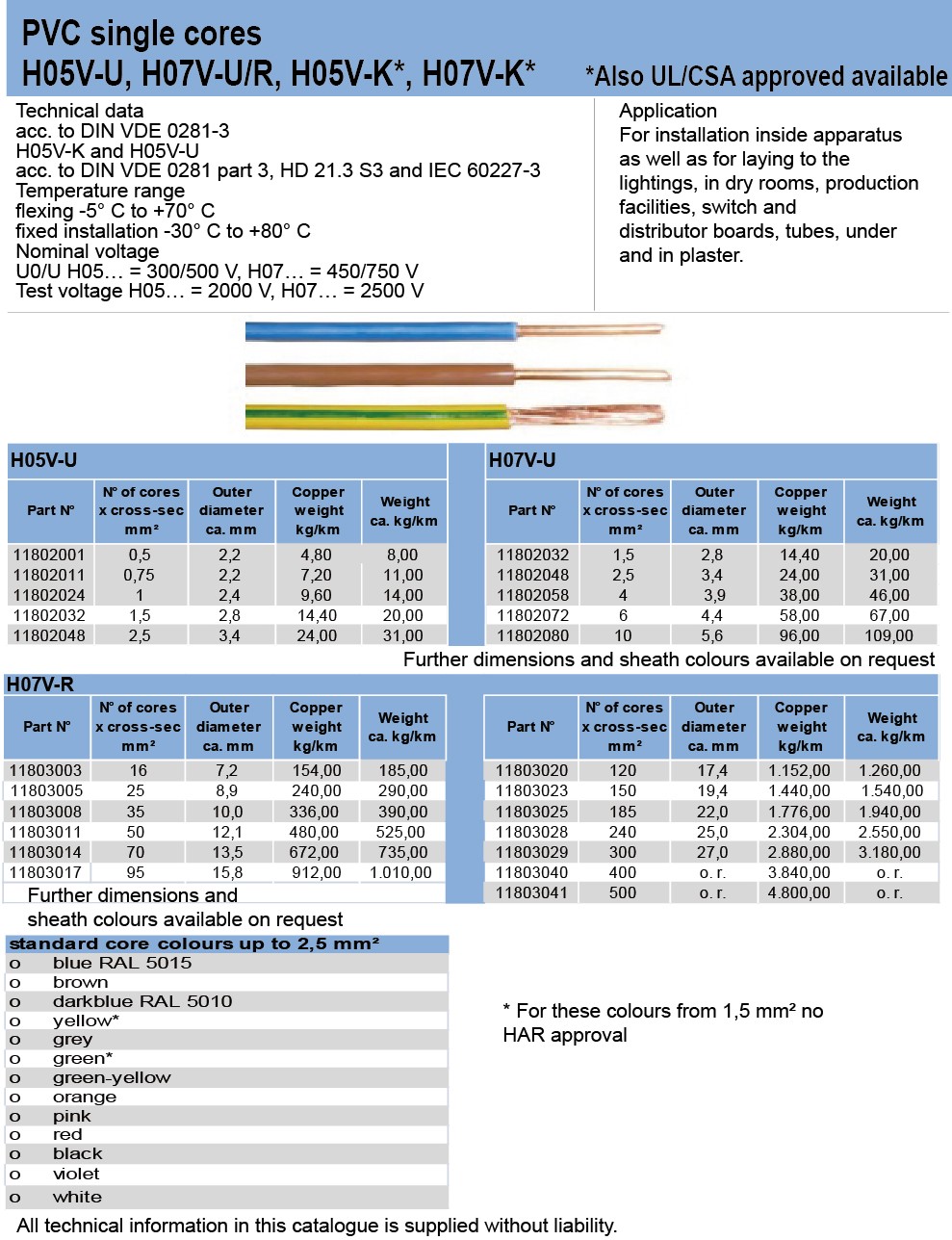 PVC single cores HO5V-U, HO7V-U/R, HO5V-K*,HO7V-K* Also UL/CSA approved available