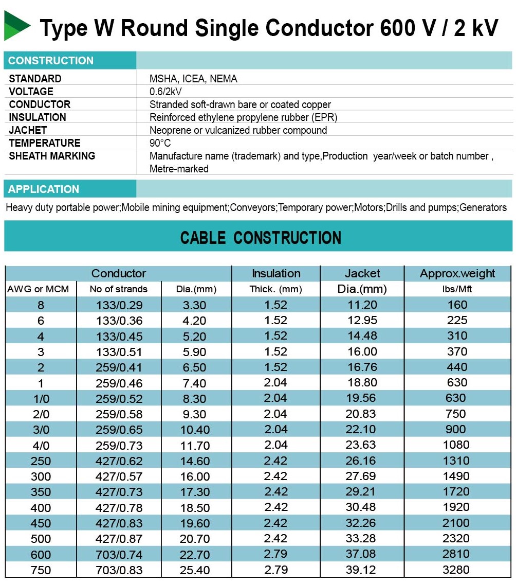Type W Round Single Conductor 600 V/2 kV