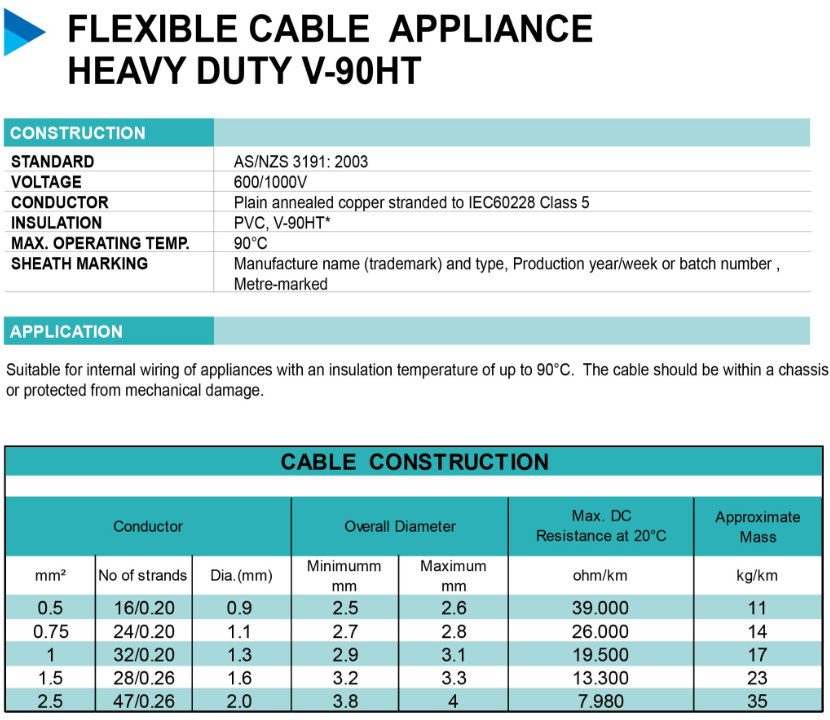 Suitable for intemal wiring of appliances with an insulaion temperature of up to 90’c, The cable should be within a chassisor protected from mechanical damage.