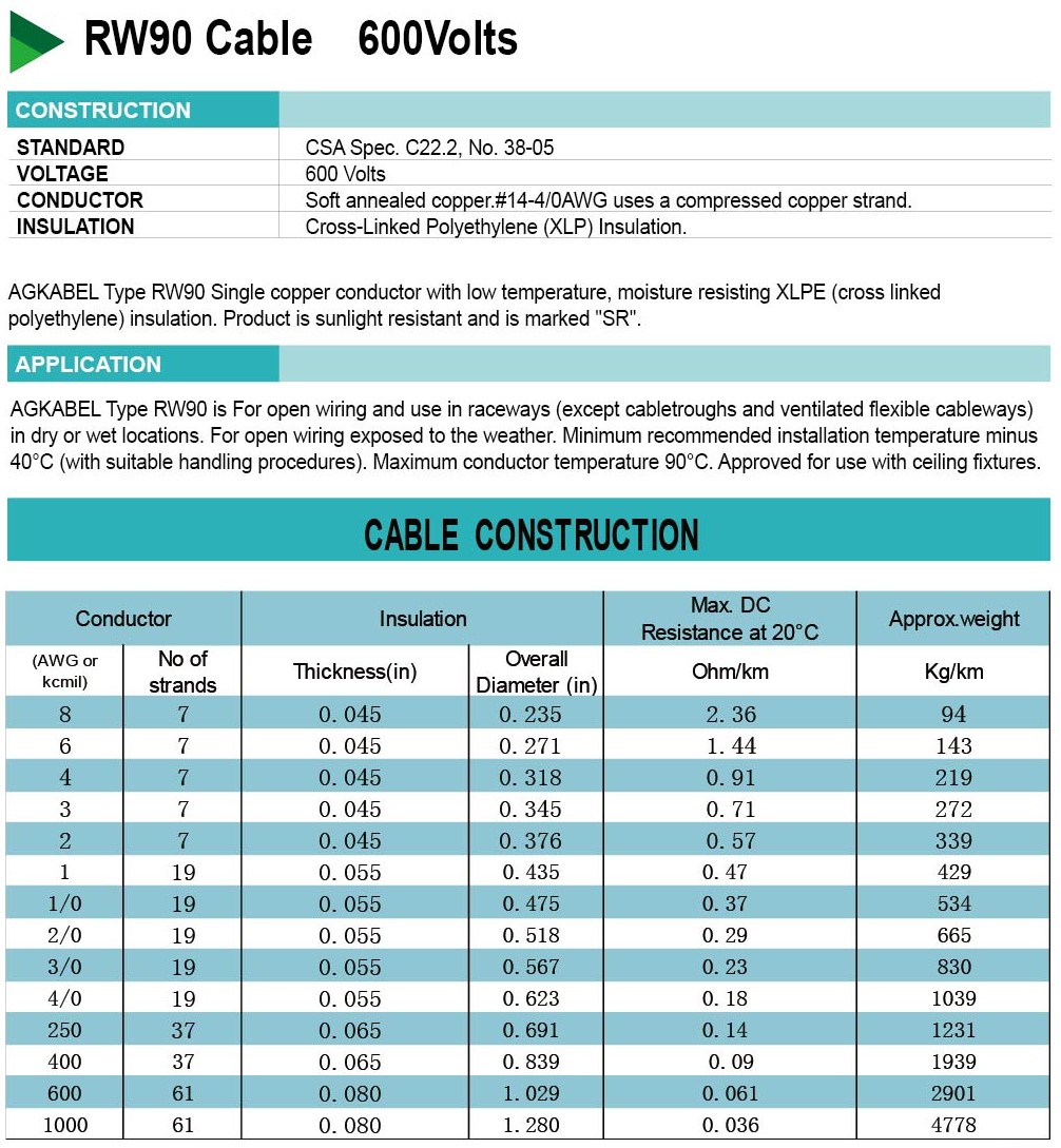 RHH or RHW or USE (Underground ServiceEntrance Cable)/RW90 Cable 600Volts